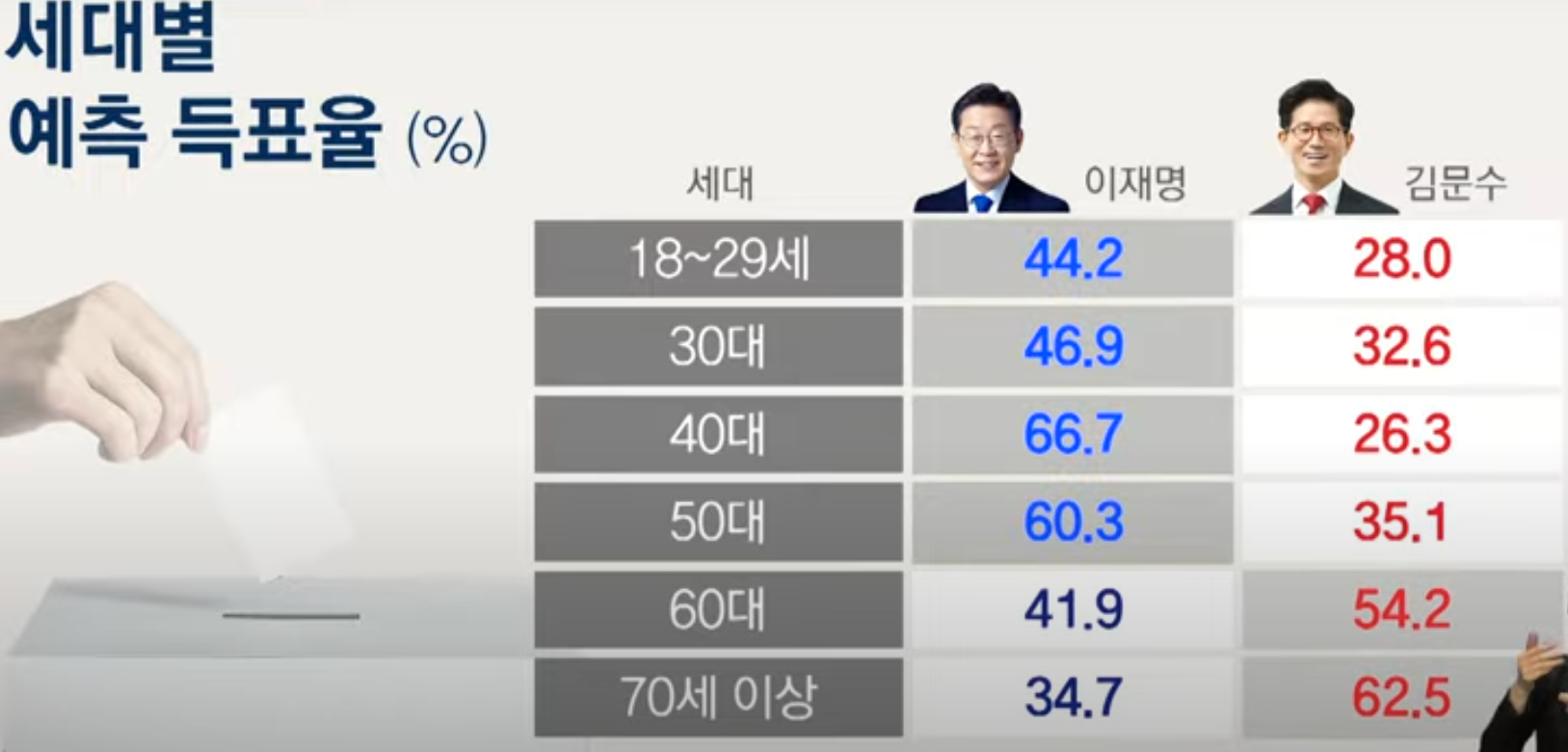 세대별로는 전 연령대에서 이재명 후보가 고르게 지지를 받았지만, 60대 이상 유권자들은 김문수 후보에게 더 많은 표를 줬습니다.